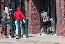 Looting soon spread to several other businesses near the main protest site.[73][68] Later in the evening on May 27, the same AutoZone store became the first building to be set on fire during the unrest.[78][80] Some protesters attempted to put out the AutoZone fire, while others celebrated and took selfies.[81] Another fire was started inside a nearby Cub Foods grocery store.[68] By 9:24 p.m., Minneapolis police had run out of chemical irritants and Minnesota State Patrol officers abandoned attempts to stop the looting.[73]