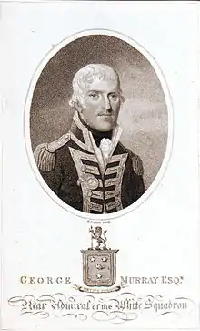 Vice-Admiral Sir George Murray KCB (January 1759 – 28 February 1819) was an officer in the Royal Navy who saw service in a wide range of theatres and campaigns. His active naval career spanned the American War of Independence and the French Revolutionary and Napoleonic Wars. Murray served under many of the most notable commanders of his age and participated in several of their greatest victories. He was with Parker and Howe in the West Indies and North America, Johnstone and Hughes in the East Indies, Jervis at Cape St Vincent, Nelson at Copenhagen, and took part in a host of other actions and engagements. Temporarily a captive of the French he was a keen scholar and spent time learning the French language and their naval customs, as well as being a competent surveyor, experience that was to help him in later life. He had a particularly enduring friendship with Nelson, who personally requested his services as his captain of the fleet. It was only chance that prevented Murray from serving as such at Trafalgar. With Murray absent, Nelson declined to appoint a replacement, one biographer reasoning that "none but Murray would do".[1]