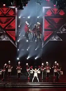 Madonna also performed "Give Me All Your Luvin'" the same year on The MDNA Tour. After the performance of "Express Yourself" ended, she began performing "Give Me All Your Luvin'" dressed as a drum majorette in a white-and-red uniform with tall white boots. Phillips explained that the ensemble was created and inspired by a 1940s majorette look, and she added Swarovski crystals to the dress.[113] Madonna sang the song on stage while a drumline was suspended in mid-air, and M.I.A. and Minaj appeared on the video screen. Caryn Ganz from Spin called the performance as the "night's most innovative moment" while Brian McManus from Rolling Stone was impressed with the drumline levitation on top of the stage.[114][115] Niv Elis from The Jerusalem Post declared the performance as one of the show's "wow" moments.[116] The November 19–20, 2012, performance of "Give Me All Your Luvin'" at Miami's American Airlines Arena, was recorded and released in Madonna's fourth live album, MDNA World Tour.[117][118]