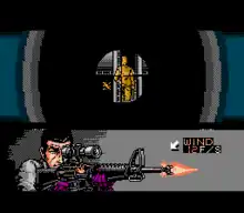 The Sniper Screen, which makes use of Golgo 13's experience as an assassin, features a close-up of him aiming a gun and in the background a close-up of the target site. When the player is aiming the gun and preparing to fire, the wind speed and direction should be taken into consideration.