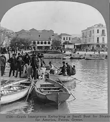 Greek immigrants embarking in a small boat for a steamer for America from the port of Patras, 1910