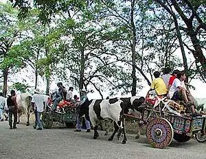 Typical Costa Rican ox-drawn carts carry wood during an annual festival in Nicoya, Guanacaste.