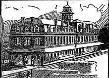 The first station in Harriman, New York, then known as Turner, was first constructed around 1838 by Peter Turner, as one of the many stretches of the New York and Lake Erie Railroad was constructed through the town. The station itself was a 400 feet (120 m) long brick depot, three stories tall, and topped with a French roof. The station sat alongside the railroad tracks and was called the Orange Hotel.[2] The dining room of the new structure was able to hold 500 people at a time and accommodate them with good food.[3] During the planning of the Erie, there was some concern to whether or not the railroad would work its way through Harriman at all, instead of bypassing nearby Goshen and Middletown in favor of a terminus at Newburgh, also on the Hudson River.[4] Train service to Harriman began in 1841, when the New York and Lake Erie ran its first trains on June 30, 1841, from Piermont-on-Hudson, the determined eastern terminus, to Goshen, the western end.[5]