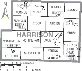Harrison County is a county located in the U.S. state of Ohio. As of the 2020 census, the population was 14,483,[3] making it the fifth-least populous county in Ohio. Its county seat and largest village is Cadiz.[4] The county is named for General William Henry Harrison, who was later President of the United States.[5]