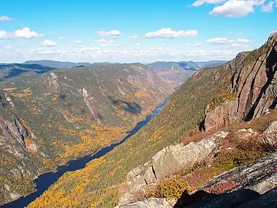 At the heart of this valley, whose walls can reach up to 800 metres (2,600 ft) in height, flows the Malbaie River, frequented among others by the Sea Lamprey as well as by the Atlantic salmon.[3]
