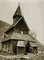 One Anglo-Saxon church, however, arguably is a stave-church: that at Greensted in Essex. Also, some of the earliest Anglo-Saxon churches consisted only of wooden towers, to which naves were added only later in the Middle Ages,[76] for example at Earls Barton. These have sometimes been compared to stave churches, especially those with a central raised section,[77] and many of the stave churches have been elongated or made cruciform from an originally square plan. For example, the reconstructed Øye Stave Church is square, and the traces of the earlier church under Ringebu stave church show an almost square building.[78]