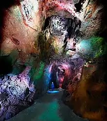 There are two caves at the Heights of Abraham, the Great Masson Cavern and the Great Rutland Cavern, both previously mined for Lead ore and Fluorspar. It is thought that lead mining in this area began in Roman times and reached its peak in the 1700s. As deposits began to dwindle, and cheaper lead was imported in the 1800s, the miners found a far more lucrative use for the caves as tourist attractions; in the process of excavation a large network of caverns and passageways were created which wealthy visitors would now pay to see. There are regular guided tours to retrace the miner's footsteps with a nearby exhibition of photography, fossils and an information film, explaining the cave's history.[2][4]