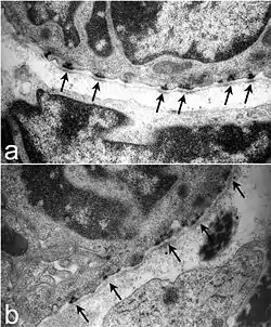 Hemidesmosomes are very small stud-like structures found in keratinocytes of the epidermis of skin that attach to the extracellular matrix. They are similar in form to desmosomes when visualized by electron microscopy, however, desmosomes attach to adjacent cells. Hemidesmosomes are also comparable to focal adhesions, as they both attach cells to the extracellular matrix. Instead of desmogleins and desmocollins in the extracellular space, hemidesmosomes utilize integrins. Hemidesmosomes are found in epithelial cells connecting the basal epithelial cells to the lamina lucida, which is part of the basal lamina.[2] Hemidesmosomes are also involved in signaling pathways, such as keratinocyte migration or carcinoma cell intrusion.[3]