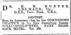 Hunter's February 1908 advertisement for his independent dental surgery practise in Bendigo.