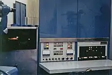 Amongst other devices, the Camden location produced PDP-8 computer-driven X-ray diffractometers in the mid-late 1960s, one of which is believed to be still functional at Oxford University Chemistry Dept. in 2017. Development began with a linear diffractometer[5] in the late 1950s - early 1960s but this was superseded around 1965 by the Y290, a four-circle diffractometer,[6] the electronics for which were developed at the University of Manchester by Prof David B.G. Edwards (Computer Science)[7] along with Owen S. Mills (Chemistry).[8] The early models (actually referenced Y230) used a Ferranti computer for controlling the diffractometer but, due to reliability issues, the cheaper and more compact PDP-8 became the computer of choice for the Y290 model. One of the production engineers claimed that the electronic research department in Camden (headed by Arthur Long) had PDP-8 No 4 from Digital Equipment Corporation (DEC), so Hilger and Watts was likely to have been one of the first PDP-8 customers. The book ‘Single Crystal Diffractometry’[9] by U.W. Arndt and B.T.M. Willis (C.U.P., 1966) has photographs and other excellent diagrams showing the construction of these machines; both authors were involved in their development. The four-circle diffractometer was originally designed for neutron work at the Atomic Energy Research Establishment Harwell Laboratory but it became better known in field of X-ray crystallography. Photographs showing prototypes of both instruments may be seen in a review article by U.W. Arndt.[10] For commercial production of the four-circle diffractometer, Hilger and Watts won two Queen's Awards to Industry, the first for Services to Export in 1966 and the second for Technological Achievement in 1968.[11] In the late 1960s the cost of the four-circle system was around $130,000.