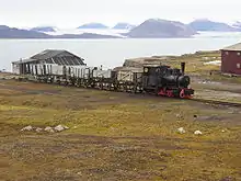 Northern Exploration Company had conducted trial operations with mining on Blomstrandhalvøya, a headland across Kongsfjorden from Ny-Ålesund, in 1906.[22] The British company set forth claims to the southern part of the bay in 1919, arguing that they had conducted a valid occupation of that area as well.[23] An agreement was struck between the British company and the Government of Norway on 26 October 1925, whereby two-thirds of the land in question was waived and variously given to Kings Bay, Kulspids, Stavanger Spitsbergen and the government for £37,000. The remaining areas were bought by the state in 1932.[24] Falling coal prices led to a production halt during the winter of 1925–26, in which only 17 men stayed the winter.[25] Ordinary operations resumed in 1926, with production commencing in the Ester Mine.[24]