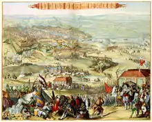 In 1721, a French commune was founded in the city for the Huguenots.[8] The French were subject to separate French law and had a separate French court, which existed until 1809.[8] In the following years, large groups of Huguenots settled in the city, bringing new developments into the city crafts and factories. The French greatly contributed to the city's economic revival, and were treated with reluctance by the German burghers and city authorities.[9] The population increased from 6000 in 1720 to 21,000 in 1816, and 58,000 in 1861.
