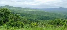 This area is situated between the two Umfolozi Rivers where they divide into the Mfolozi emnyama ('Black Umfolozi') to the north and the Mfolozi emhlophe ('White Umfolozi') to the south.[10] This area is to the south of the park and is generally hot in summer, and mild to cool in winter, although cold spells do occur.[2] The topography in the Umfolozi section ranges from the lowlands of the Umfolozi River beds to steep hilly country, which includes some wide and deep valleys. Habitats in this area are primarily grasslands, which extend into acacia savannah and woodlands.