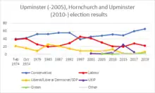 The predecessor seats were lost by the Conservatives in Labour's landslide 1997 victory, but Upminster was one of the few Conservative gains in 2001 and Hornchurch was lost by Labour in 2005; this area is now very safe territory for the Conservatives since it gained their strongest areas from Hornchurch in the boundary changes. The 2015 result made the seat the 146th safest of the Conservative Party's 331 seats by percentage of majority.[5] At the 2015 general election, the constituency was one of five in Greater London where the UK Independence Party came in second place.[6]