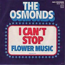 After the Osmonds left Uni Records and broke through as pop stars with "One Bad Apple" for MGM Records, Uni re-released "I Can't Stop" in 1971, when it reached #96 on the Billboard chart.[1] Uni's successor MCA Records again re-released "I Can't Stop" in 1974 for the United Kingdom market, which reached #12 on the UK Singles chart.[2]