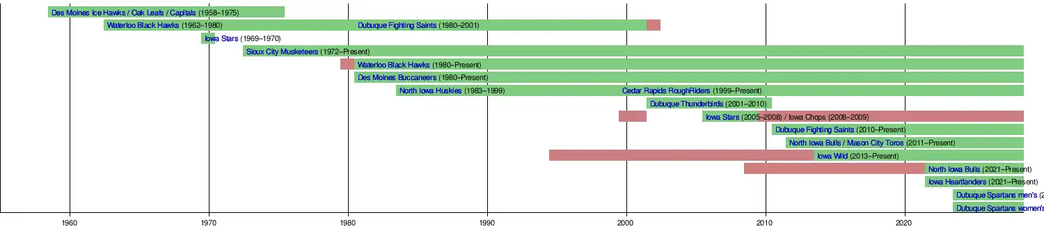 Dubuque SpartansDubuque SpartansIowa HeartlandersNorth Iowa BullsIowa WildNorth Iowa BullsDubuque Fighting SaintsIowa StarsDubuque ThunderbirdsCedar Rapids RoughRidersNorth Iowa HuskiesDes Moines BuccaneersWaterloo Black HawksSioux City MusketeersIowa Stars (1969–70)Dubuque Fighting Saints (1980–2001)Waterloo Black HawksDes Moines Oak Leafs