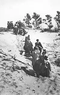 It wasn't until the 19th century that native villages once again were scattered through the area, but this was soon followed by European settlement.[5] Joseph Bailly was the earliest recorded settler in the dunes. He moved here from trading villages around Niles, Michigan. Settling along the Calumet River.[5] Soon he was joined by a series of other settlers and the communities in the dunes began to develop. They included Chesterton, Porter, Tremont, and the Town of the Pines. These pioneer communities grew and expanded.