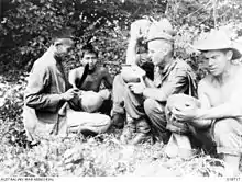 Native Indonesians in Labuan Island, British Borneo (present-day Malaysia) serving coconut water to Australian troops as a gratitude during the Battle of Labuan to recapture the island from the Japanese.
