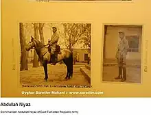 Liu Pin, a provincial commander in Kashgar Region with 700 troops at his command, responded to the rebellion by launching a squadron of nine Soviet planes to bomb Yangi Hissar and Yarkand.[3] After Muhiti reached Srinagar in India, the following year, he went on pilgrimage to Mecca.[4] A buildup of Soviet military assets occurred in Xinjiang before the outbreak of war. Around Kashgar, the Soviets sent AA guns, fighter planes, and soldiers of Russian and Kyrgyz origin in great numbers.[5]