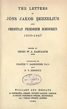 • Letters of Jöns Jakob Berzelius and Christian Friedrich Schönbein. London: Williams & Norgate. 1900.