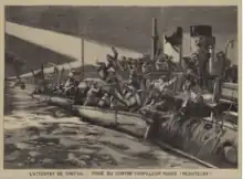 After transferring to the 4th Destroyer Division in the 2nd Fleet, Asashio participated in the Battle of Tsushima on 27–28 May 1905.[4][13] Responding to a signal from the unprotected cruiser Chihaya on the afternoon of 27 May, the 4th Destroyer Division (Asagiri, Asashio, Murasame, and Shirakumo) mounted a torpedo attack against the damaged and burning Russian battleship Knyaz Suvorov, which was making 10 knots (19 km/h; 12 mph).[14] Approaching Knyaz Suvorov at 18 knots (33 km/h; 21 mph) on the opposite course from her, Asagiri and Murasame each launched a torpedo at a range of about 800 metres (870 yd) and Asashio got off two shots, but none of the torpedoes hit.[14] Asagiri and Murasame closed to 300 metres (330 yd) and each fired a second torpedo, and Murasame scored an apparent hit that caused Knyaz Suvorov to heel 10 degrees.[14] Shirakumo did not fire, finding that Knyaz Suvorov had lost all steaming power and come to a stop before she could achieve a firing position.[14] Knyaz Suvorov later sank.[15]