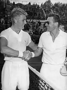 Drobný began playing tennis at age five, and, as a ball-boy, watched world-class players including compatriot Karel Koželuh.[4] He had an excellent swinging left-handed serve and a good forehand.[5] Drobny played in his first Wimbledon Championship in 1938, losing in the first round to Alejandro Russell. After World War II Drobný was good enough to be able to beat Jack Kramer in the fourth round of the 1946 Wimbledon Championship before losing in the semifinals.[6] In 1951 and 1952, he won the French Open, defeating in the final Eric Sturgess and then retaining the title the following year against Frank Sedgman.[7] Drobný was the losing finalist at Wimbledon in both 1949 and 1952 before finally winning it in 1954 by beating Ken Rosewall for the title, the first left-hander to capture Wimbledon since Norman Brookes.[8]