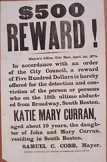 Reward poster issued by the City of Boston for information about Katie Curran's abductor