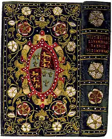 Despite the commoditisation of book production due to the printing press, the artistic tradition of jewelled bookbinding continued in England, though less frequently and often in simpler designs.[15] Luxury bindings were still favoured by the English Court, which is evident from the records on the private library of Queen Elizabeth I, who favoured velvet bindings. On a visit to the Royal Library in 1598, Paul Hentzner remarked on the books "bound in velvet of different colours, though chiefly red, with clasps of gold and silver; some have pearls, and precious stones, set in their bindings."[16] Throughout the 16th and 17th centuries, the style evolved to be one using velvet, satin, silk, and canvas in bookbinding decorated less with jewels and more with embroidery, metal threads, pearls, and sequins.[17]
