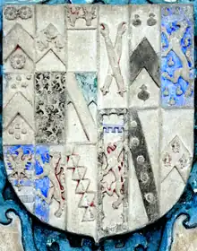 Heraldic escutcheon from memorial showing the arms of Wadham, of nine quarters, impaling Tregarthin, of six quarters