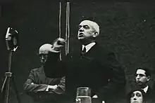 During late autumn of 1931 Beunza was getting increasingly disappointed with the emerging republican regime, not only due to rejection of Estatuto de Estella, but also because of what he perceived as militantly sectarian secularism, imposing its ideas over the Catholic masses. A scholar writes about “his parliamentary correctness deserting him” when Beunza concluded one of the addresses with what might have been interpreted as threat of violence in name of “dignity of free men against tyranny”, since “our defence will meet aggression wherever it strikes”.[167] During a rally in November “Joaquín Beunza, a far from extreme Carlist, thundered to an audience of 22,000 people” that the Catholics should defend their rights by all means, legal or not,[168] and declared the Cortes a zoo.[169] Though in some other issues he supported innovative legislation – e.g. he argued in favour of female vote[170] - the government considered the Basque-Carlist alliance a dangerous one and the minister of interior Casares Quiroga informed Beunza that all their rallies were suspended.[171] In December the Cortes adopted the constitution, which included most articles earlier challenged by the right.