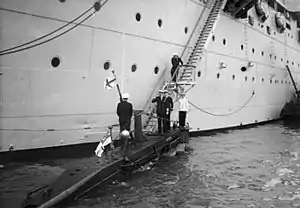 Admiral Sir John Eccles, Commander in Chief Home Fleet, boarding X craft MINNOW at Portland