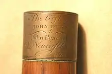 A set of pipes [6] with a single-octave chanter was presented by John Dunn (bagpipe maker) to John Peacock in 1797; this set now lacks the original chanter, but still carries the original engraved ferrule on the drone-stock reading: 'The Gift of John Dunn to John Peacock Newcastle 1797'.
