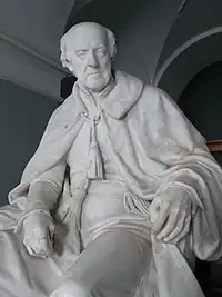 Rolle died in 1842 at Bicton House in Devon.[35] As part of her re-building of Bicton Church as St Mary's Church, completed in 1850, his widow Louisa retained as a Rolle mausoleum part of the ruins of the ancient Church of the Holy Trinity on the site and erected therein an elaborate monument to the memory of her husband, designed by Pugin and sculpted in the London workshop of George Myers. It consists of a Gothic-style chest tomb in front of a high arch filled-in with Gothic-style tracery and sculpted figures. In the same mausoleum is the baroque monument to his distant cousin Denys Rolle (1614–1638), who had inherited Bicton from his mother Anne Denys. He was third in descent from John Rolle (died 1570), the eldest son and heir of the patriarch George Rolle (died 1552) of Stevenstone, MP for Barnstaple. The Rolle Mausoleum is the private property of Lord Clinton and is not open to the public as from 2012.