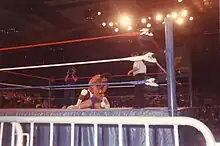 Estrada (purple shorts) being held to the canvas by Tito Santana on 7 March 1989