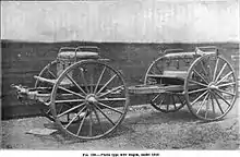 The image from Electrical instruments and telephones of the US Signal Corps 1911 is accompanied by the following text: "In the latest model the front element of the vehicle carries the reel and wire and is known as the reel cart. The rear element, known as the signal cart, is a chest of compartments suitable for carrying the buzzers, batteries, flags, field glasses and other equipment used by field companies of the Signal Corps. The rear signal cart may be detached from the reel cart and the former used alone in laying and recovering wire. The pintle type wagon is drawn by four horses. The signal cart chest can be moved forward and backward to adjust weight on the horses' necks".[2][3]