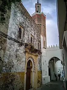 The mosque of the kasbah of Tangier was thus built by Ali Errifi, under Moulay Ismail's reign in the late 17th century.[2] Errifi was also responsible for rebuilding the city's Grand Mosque further south.[2] The mosque was expanded by Errifi's grandson, Ahmed, who added its minaret and ornate entrance.[2] Its prayer hall was expanded under Sultan Muhammad ibn Abd al-Rahman (Mohammed IV), who ruled between 1859 and 1873.[2] It was restored around 1889 for the visit of Sultan Moulay Hassan I.[2] In 1921, the official in charge of religious foundations (habous) in the region restored the mosque but covered up much of its original decoration in the process, using new colors.[2] Some of this cover-up has been cleared in recent years during renovations that finished around 2015.[3]