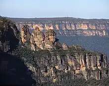 Katoomba's main industry is tourism based on its mountain scenery.[17] The rock formation known as the Three Sisters, viewable from Echo Point about 2 kilometres (1.2 mi) south of the main town, attracts thousands of visitors each year.[18] Other features of the Jamison Valley visible from Echo Point include Mount Solitary and the rock formation known as the Ruined Castle. A short walk from Echo Point leads to the Giant Stairway which provides access to a number of nature walks through the Valley. Several of the Jamison Valley tracks, including the Stairway itself, were closed in recent years due to maintenance, but most have since been re-opened.[19] The local geography includes extensive areas of dense warm temperate rainforest, hanging swamps and a series of waterfalls.
