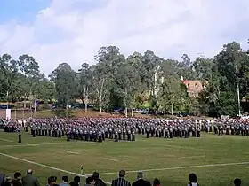 The cadet corps's annual passing-out parade on the JS White Oval. The school chapel is in the background.