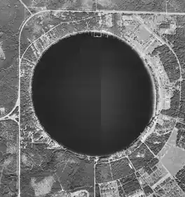 Kingsley Lake is an almost perfectly circular lake of about 2,000 acres (810 ha) in North East Florida, located inside Clay County about six miles (9.7 km) east of Starke, Florida. According to some sources, it is the oldest and highest lake in Florida,[3] located on the edge of the Trail Ridge formation. The lake is a very stable lake with a sandy bottom. Its deepest point is about 100 feet (30 m) inside of a steep sinkhole within the lake, but the lake itself is not considered a sinkhole.[1] Kingsley Lake is so nearly circular that pilots call it the "silver dollar lake". There are around 180 docks around the lake, mostly around the western half of the lake encompassing the small community of the same name. Camp Blanding is on the eastern side of the lake as part of the Florida National Guard, as well as a small airstrip just to the southeast of the lake as part of Camp Blanding. The lake is about 30 miles northeast of Gainesville, 30 miles southwest of Jacksonville, and 30 miles northwest of Palatka.