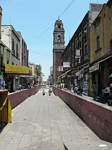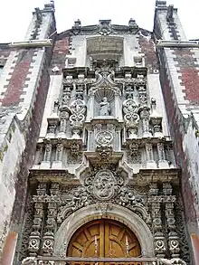 The main facade contains some aspects of the older churches that surround it, such as the cross layout, the relief work and window of the chorus, although new aspects such as estipite columns were introduced.[2] The facade also contains twelve medallions done in relief, each representing an apostle. Among the columns there are ten sculptures, five of which represent bishops, four represent popes and one represents a priest, each of which are identified as learned scholars of the Church.[2] The main portal is Churrigueresque style worked in "chiluca", a hard gray stone and flanked by two pillars.[2][3] The keystone of the central arch of this entrance is decorated with a medallion with the papal coat-of-arms covered by a series of volutes. Above this, there is a relief depicting the Holy Trinity with God the Father dressed as a pope.[1] The depiction of the Trinity is due to the church's patronage by a Trinitarian brotherhood originally formed by tailors.[2]