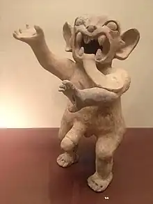 The first scholars of the Tumaco-La Tolita culture thought that its art was nothing more than the representation of the natural environment and daily life.[2] Within this line of thought, it was believed that anthropozoomorphic representations (representations of humans with animal parts) were actually representations of shamans who were undergoing a process of spiritual transformation inspired by the consumption of hallucinogenic plants. But this way of understanding the Tolita art has been questioned by current scholars, who believe that Tolita iconography truly represents the opposite of everyday life:deities, mythological ancestors, supernatural characters, and legendary heroes.[15]