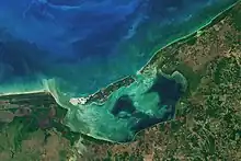 It is 72 km (45 mi) long, 24 km (15 mi) wide, and covers an area of 1,550 km2 (600 sq mi).[5] Every nine days, approximately 50% of the lagoon's water volume is renewed, primarily through the effect of ocean tides.[6] Isla del Carmen is a barrier island which separates the lagoon from the Bay of Campeche. There are two permanent channels connecting the lagoon to the Bay of Campeche – Boca de Puerto Real to the east of Isla del Carmen, and Boca del Carmen to the west. Inflow from the bay is via the Boca de Puerto Real, and outflow is via the Boca del Carmen.