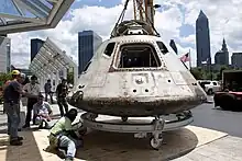 The Apollo Command Module of the 1973 Skylab 3 mission being moved to the Great Lakes Science Center