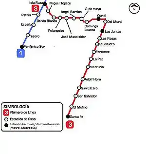 Line 3 of the Guadalajara Urban Electric Train System is the third public transport railway line in the Guadalajara metropolitan area (México) and currently its longest. The line connects the Historical Centres of Zapopan, Guadalajara and Tlaquepaque, through the Diagonal Metropolitan Vial Corridor; consisting of Juan Gil Preciado, Juan Pablo II, Manuel Ávila Camacho, Alcalde / 16 de Septiembre and Revolución / Francisco Silva Romero avenues, from the Arcos de Zapopan neighbourhood (in Zapopan) until the Central Camionera Oriente of Guadalajara (in Tlaquepaque). It has 18 stations from south-east to north-west, of which 13 are elevated (in 2 viaducts) and 5 are underground. It stretches along 21.5 km (red line, in the technical datasheet outline). It is estimated that the line moves 233,000 daily passengers.[1]