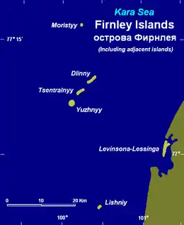 The Firnley Islands (Russian: острова Фирнлея; Ostrova Firnleya, Nynorsk: Firnleyøyane) is a group of three small islands covered with tundra vegetation and with scattered stones on their shores. They lie in the Kara Sea, close to the bleak coast of Siberia's Taymyr Peninsula, not far east of the Nordenskjold Archipelago. These islands lie about 35 km from the continental shore.