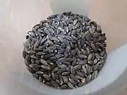 Rice can also be divided based on processing type into the two broad categories of brown and white. Brown rice is whole grain, with only the inedible hull of the seed removed, while white rice additionally has the bran and germ removed through the process of milling.[5] Milled rice may not necessarily actually be white in color; there are purple, black, and red variants of rice, which can be eaten whole grain or milled.