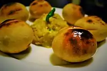 Litti is a whole wheat flour dough ball stuffed with a spiced mixture of sattu (roasted black chickpea flour).[1] Litti, along with chokha, is a complete meal that originated from the Bhojpuri region of the Indian states of Bihar and Uttar Pradesh.[2] Traditionally, the wheat dough balls are roasted on hot charcoal or dried cow dung fire. They can also be baked in an oven, roasted on a tava or fried.[1]