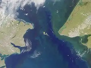 Satellite image of the Bering Strait; Little Diomede Island can be clearly seen in the middle of the strait, to the right of Big Diomede.