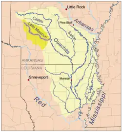 The Little Missouri River, or Little Mo, is a 147-mile-long (237 km)[2] waterway that runs from the Ouachita Mountains of southwest Arkansas into the rolling hills area in the surrounding countryside.
