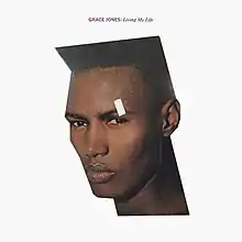 The Living My Life cover picture has been described as famous as the music featured on the record itself.[6] Like the majority of Jones' artworks at that time, this one was created by her then-partner Jean-Paul Goude, this time with an additional contribution from Rob O'Connor. It features the singer's disembodied head cut out from the original photograph and pasted onto a blank white background in a way that gives her head and face an angular shape.[7] A piece of tape, or a plaster, has been pasted over her left eyebrow, and her forehead is covered with drops of water, or sweat. This cover, as many other Goude's designs for Jones, has won critical acclaim and has been an inspiration for other artists ever since.[8]